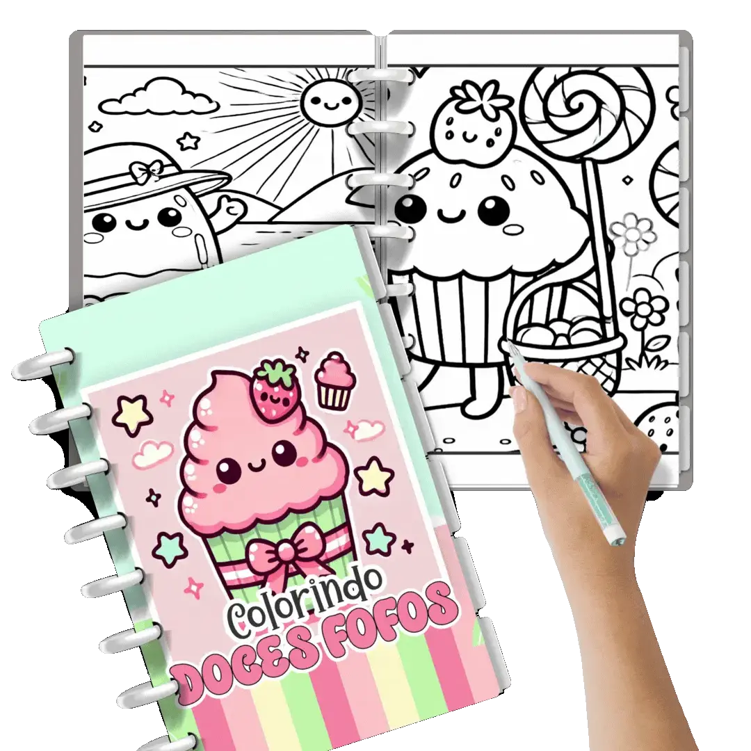 Livro digital Mundo dos Doces desenhos adoráveis de doces, cupcakes, personagens fofos e cenários mágicos da cidade dos doces.